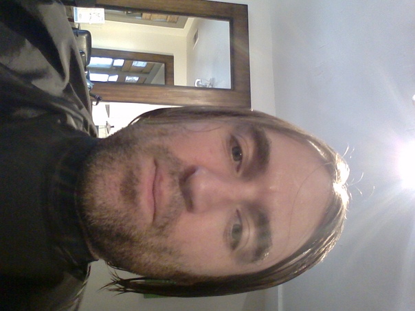 A man staring at the camera with long hair and light is shining above his head |