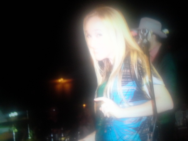 A woman in a bright blue dress standing behind a microphone. |