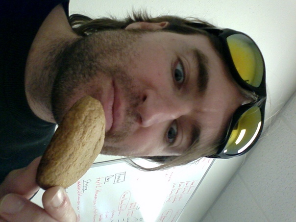 A casual, scruffy, unkempt man wearing sunglasses is standing in a plain, basic classroom holding and looking at a small piece of a whole wheat bagel. |
