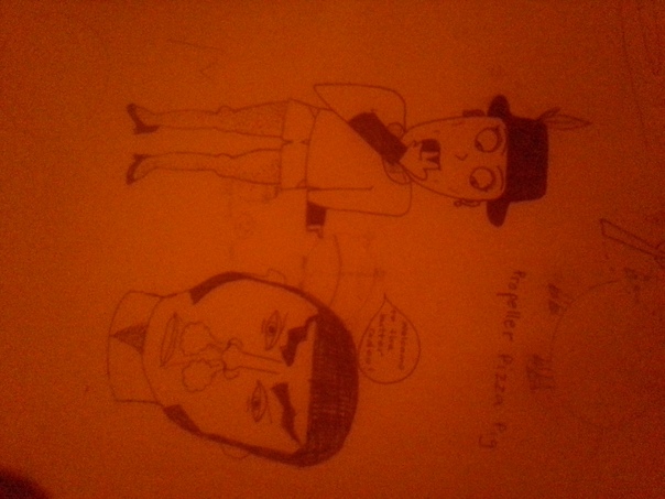 A pencil drawing on a piece of paper with comic caption bubbles. |
