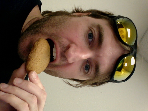 A sideways view of a Caucasian man biting into a cookie. |