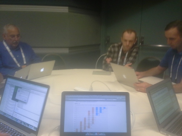 group of people discussing some statistical matter in a conference using couple of laptops |