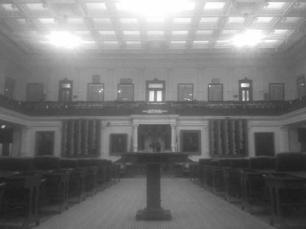 A large building with man bench seats surrounding a podium. |