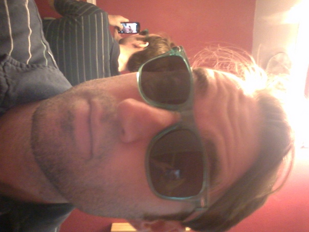 A man wearing green sunglasses standing in front of a crowd of people. |