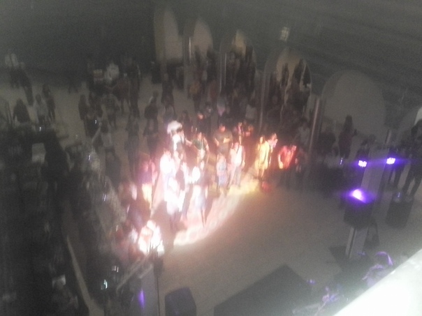 A spot light is focused on the group of people in the party |
