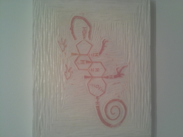 A crude carving of a lizard designed with elements from chemistry is set on a white piece of wood. |