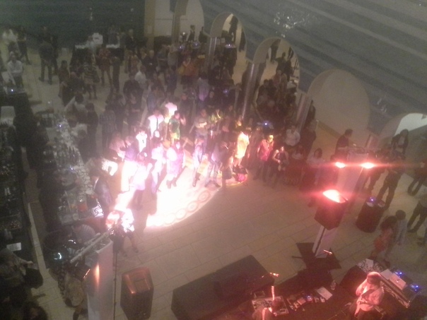 A small crowd lighted by a bright spot light observe a stage act. |