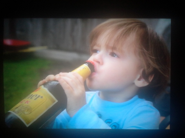 A young boy in a blue shirt drinking out of a Shiner beer bottle. |