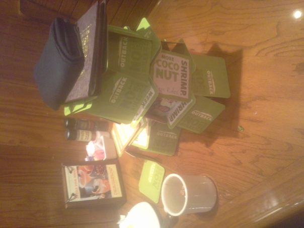 A paper structure made from empty Outback cards holds a blue napkin and menu book placed on brown table with a partially empty cup, salt and pepper shakers, sweetener packages and drink advertisement.