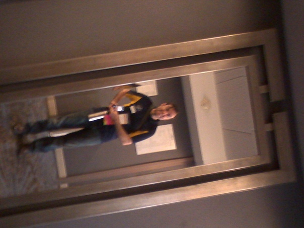 The man wearing jeans and a t-shirt takes a picture of himself in the mirror. |