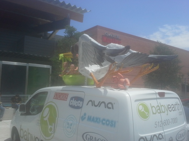 A white van wrapped in various advertisements has a giant sculpture showing a stork and babies on the top. |