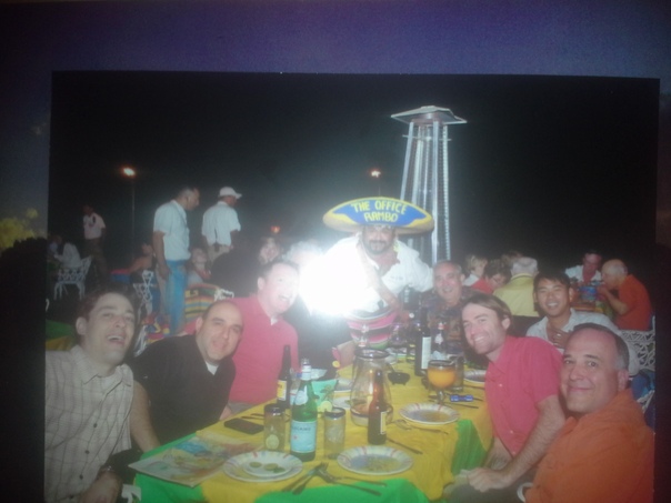 This is a picture of a group of people enjoying a Mexican meal with a man wearing a sombrero as everybody's laughing. |