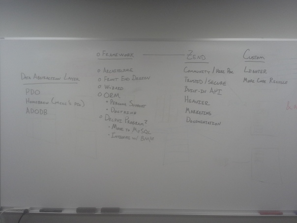 This is a white board that contains information about and characteristics of application framework technology and zend technology. |