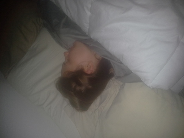 A woman with brown hair sleeps beneath a fluffy white comforter. |