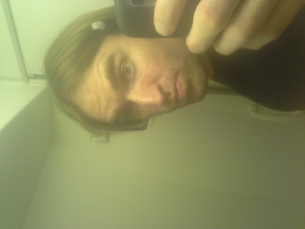 White man with longer straight brown hair taking a picture using a mirror. |