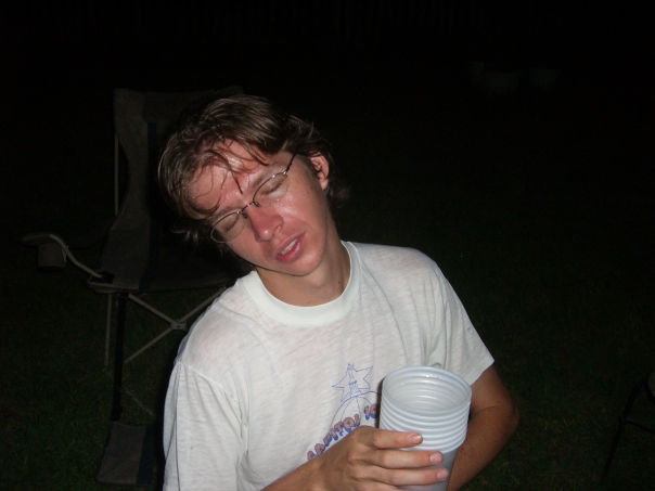 white t-shirt person looking like sleepy and in hand some plastic cups are there looking like drunken not sure