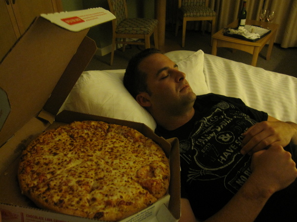 a man is sleeping peacefully on his bed with an uneaten pizza beside him.