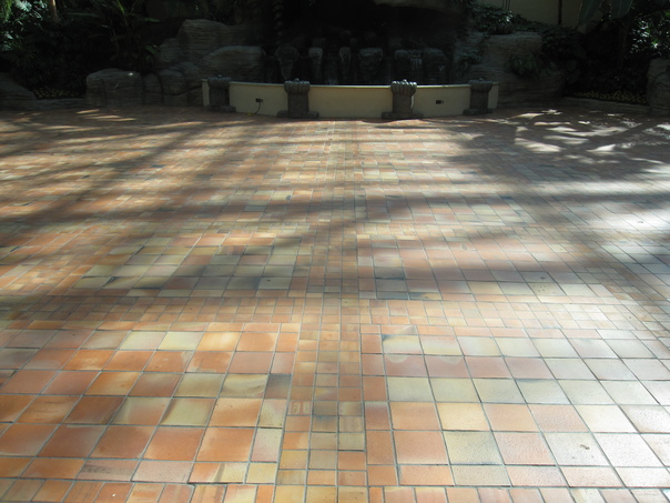 This picture shows a large floor with yellow, light brown, dark brown, and slight green tiles.