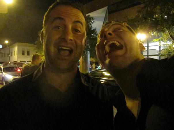 there are two men laughing and showing their teeth