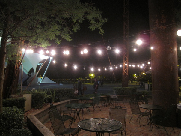 The patio was lit up and there were chairs to sit on as well as tables.