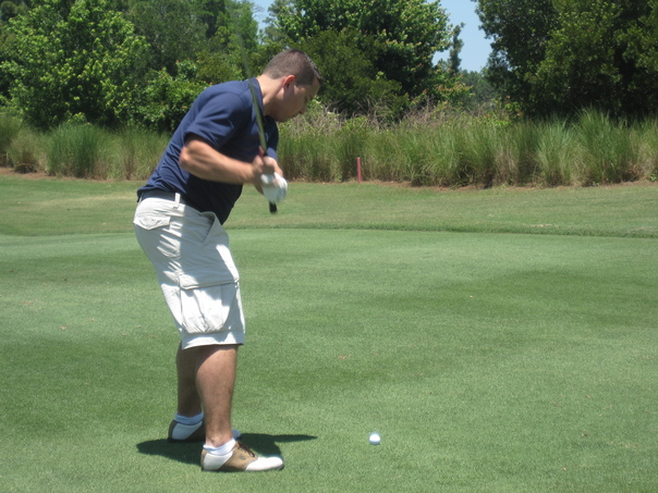 A man wearing a blue shirt and kaki shorts is swinging his club at a white golf ball.