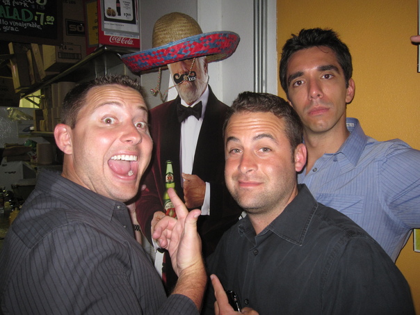 The men enjoy each other's company, as well as the cardboard man in the sombrero.