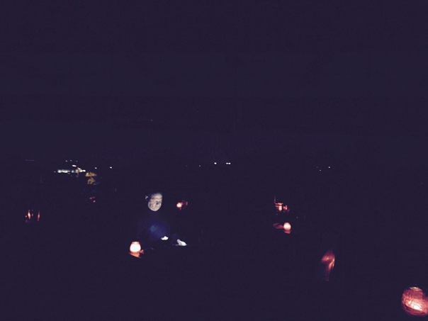 A Buddhist statue at night is surrounded by a few glowing lanterns. |