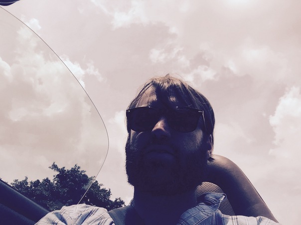 This is a filtered photograph of a man with a beard riding in a vehicle on a cloudy day. |