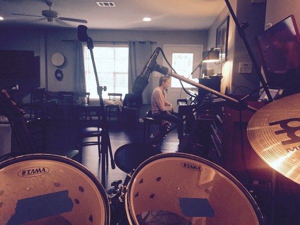 A woman sitting on a piano bench in front of a keyboard in a room full of instruments. |