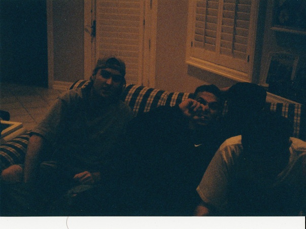 This is a picture of three rowdy friends posing for a picture where the one in the middle looks like the most fun of the group. |