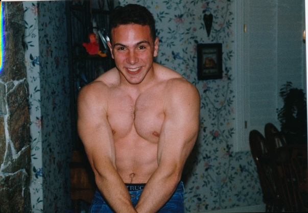 Shirtless guy in blue jeans and no shirt flexing his chest and smaillying inside the house. |