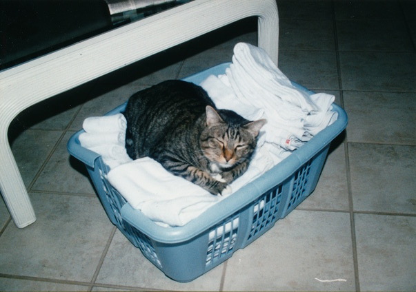 A tabby cat looking content while sleeping in a laundry basket of fresh folded towels. |