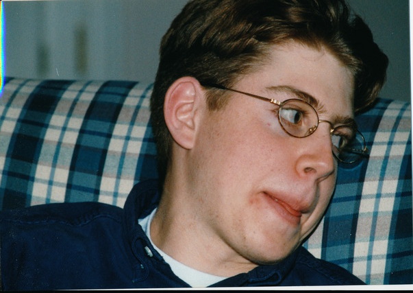 The young man is sitting down on the plaid couch looking away from the camera. |