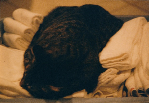 A large tabby cat sleeping on a pile of freshly folded white towels.
