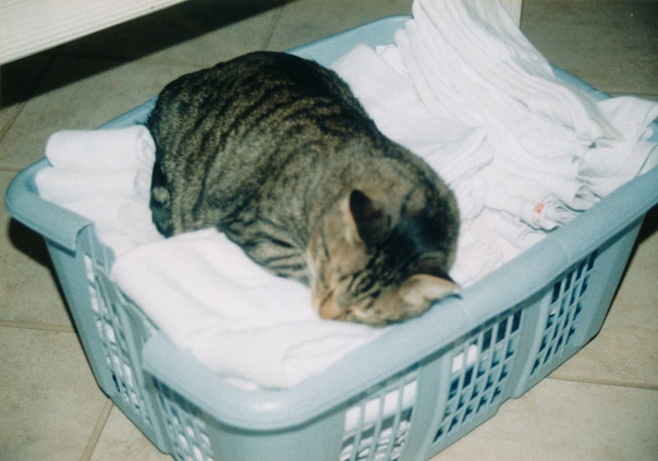 THE GRAY AND BLACK STRIPED KITTEN PICKED THE PERFECT SOFT BED FOR HIS AFTERNOON NAP. |