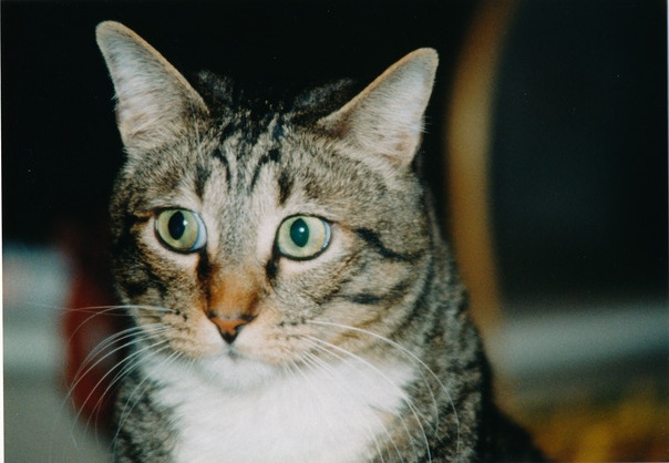 Abbey is a beautiful striped cat with lovely green eyes and a cute, brown nose. |