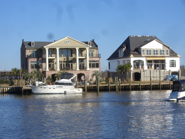 Two lovely waterfront homes, one is being built the other is completed. Theres a really cool boat in front of the home.