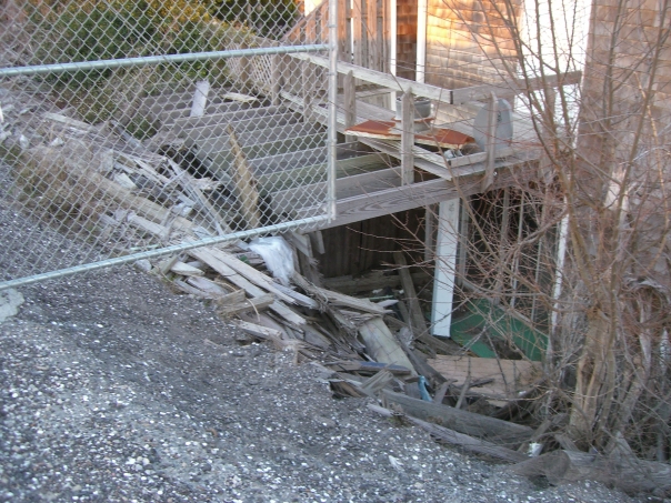 a sideyard of a house with lots of broken pieces of wood sits near a gravel driveway.