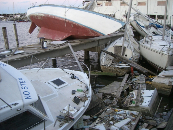 Smashed up poweboats boats and sailboats are piled together at a marina, after a very bad storm has come through the area.
