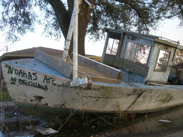 A decrepit boat on land, formerly white, now cracked, peeling, and molding, named "Noaha's Arc" with the warning "No Politicians."