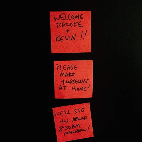 Three orange sticky notes welcoming Brooke and Kevin hang on a dark brown door.