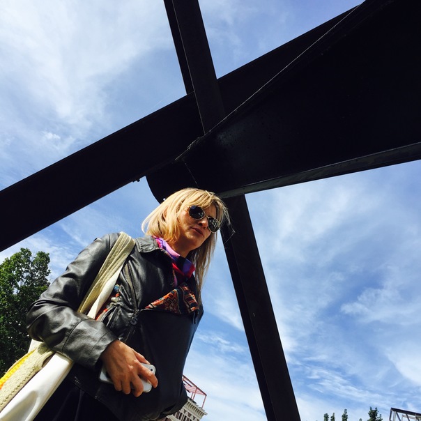 A blond woman wearing a black leather coat holds a white cell phone as she poses in front of some artistic sculpture.