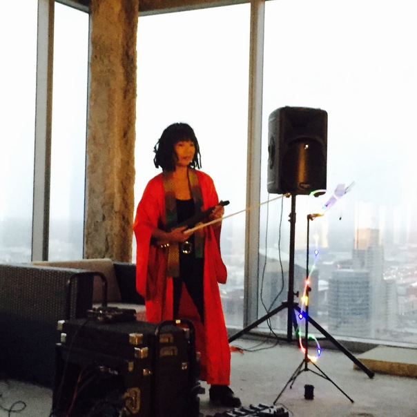 A dark haired woman in a long red robe holding a stringed instrument standing in front of windows with a city view from a high floor of a building.