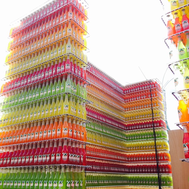 Colorful bottles arranged in neat rows stacked on top of each other.