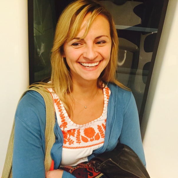 A woman with long blonde hair wearing an orange and white shirt and a blue sweater is looking down to the left.