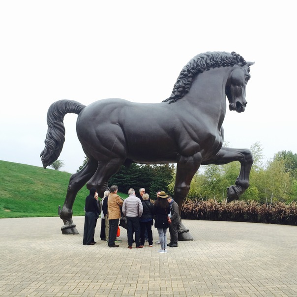 Statue of a large black horse with one leg up while a group of people stand underneath.