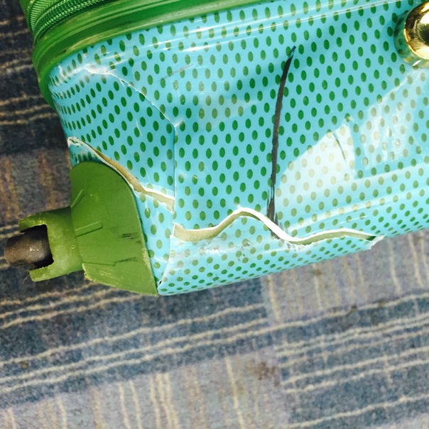 A plastic green and blue rolling suitcase has a large crack near the wheel.