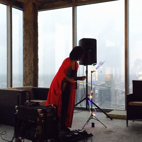 A woman in a long red coat is preparing to play music in a high rise apartment.