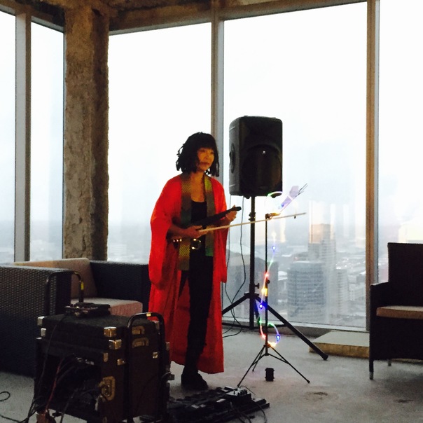 A Asian woman is wearing a bright red robe and is standing next to large black amplifiers and musical equipment.