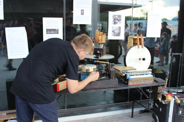 This appears to be a man working on various musical instruments in front of a building.